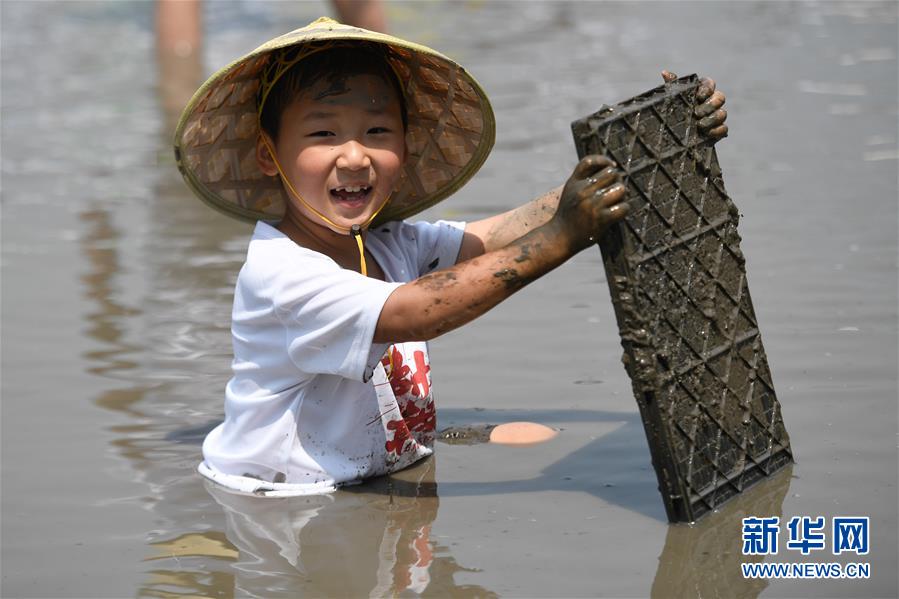 5月24日,一名小朋友在稻田里体验农事。当日,十余名小朋友在家长的带领下来到浙江省湖州市吴兴区八里店镇尹家圩粮油植保农机专业合作社的稻田中,参加亲子插秧、稻田捉鱼等农事体验活动。新华社记者黄宗治摄