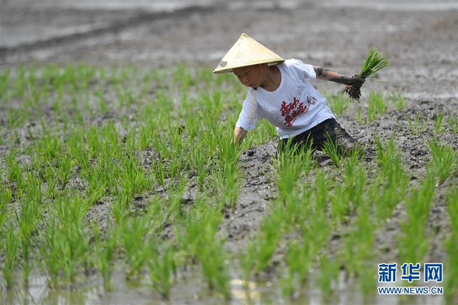 5月24日,一名小朋友在稻田里插秧。当日,十余名小朋友在家长的带领下来到浙江省湖州市吴兴区八里店镇尹家圩粮油植保农机专业合作社的稻田中,参加亲子插秧、稻田捉鱼等农事体验活动。新华社记者黄宗治摄