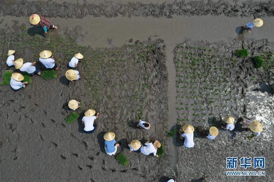 5月24日,小朋友与家长在稻田里参加亲子插秧比赛(无人机照片)。当日,十余名小朋友在家长的带领下来到浙江省湖州市吴兴区八里店镇尹家圩粮油植保农机专业合作社的稻田中,参加亲子插秧、稻田捉鱼等农事体验活动。新华社记者黄宗治摄