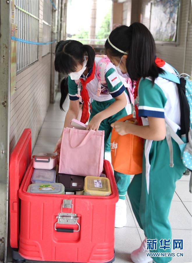 5月25日,广州市荔湾区蒋光鼐纪念小学的学生将自带的饭盒放在教室门口的箱子里,工作人员将为学生统一配餐。当日,广州市各小学一至三年级学生正式开学复课。至此,广州市中小学各年级已全部开学复课。新华社记者卢汉欣摄
