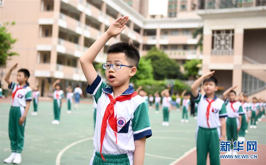 5月25日,广州市荔湾区蒋光鼐纪念小学的学生在参加升国旗唱国歌仪式。当日,广州市各小学一至三年级学生正式开学复课。至此,广州市中小学各年级已全部开学复课。新华社记者卢汉欣摄