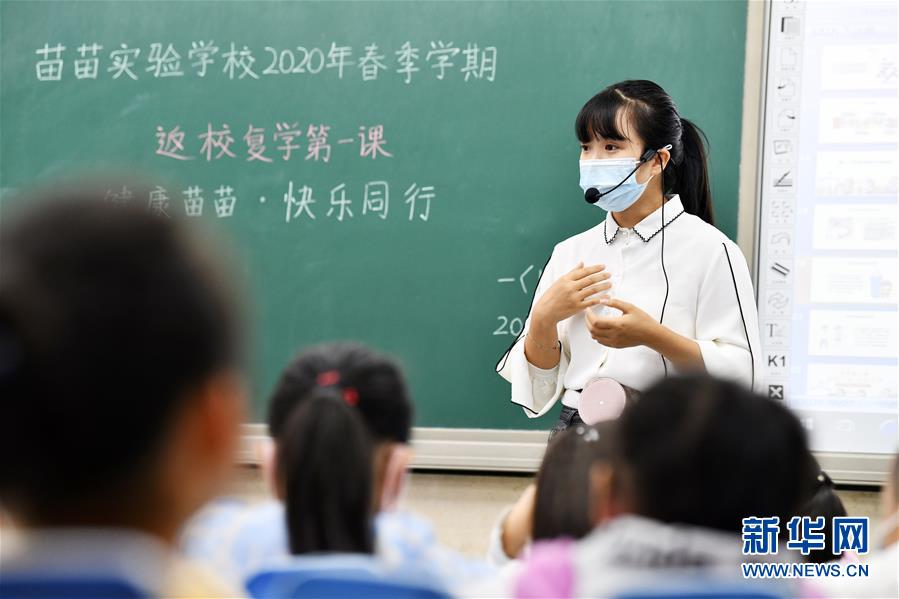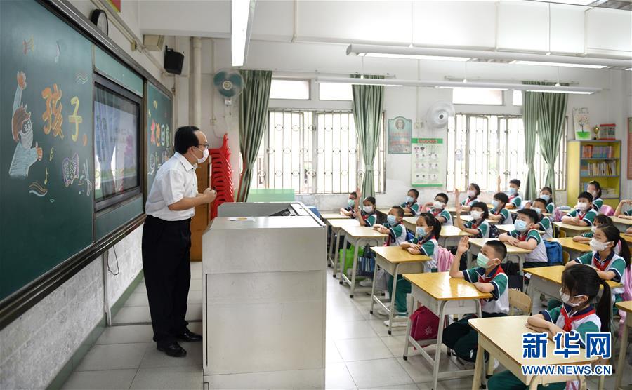 5月25日,广州市荔湾区蒋光鼐纪念小学的老师在给学生上开学第一课。当日,广州市各小学一至三年级学生正式开学复课。至此,广州市中小学各年级已全部开学复课。新华社记者卢汉欣摄