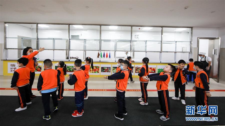 5月25日,贵阳市中天北京小学未来方舟校区学生在集合时保持间距。新华社记者欧东衢摄
