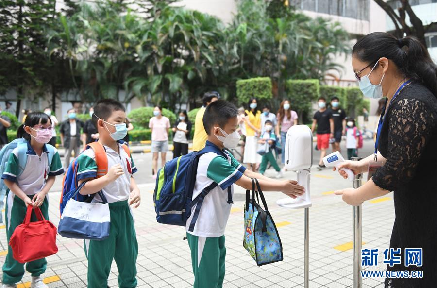 5月25日,广州市荔湾区蒋光鼐纪念小学的老师在校门口为返校学生检测体温。当日,广州市各小学一至三年级学生正式开学复课。至此,广州市中小学各年级已全部开学复课。新华社记者卢汉欣摄