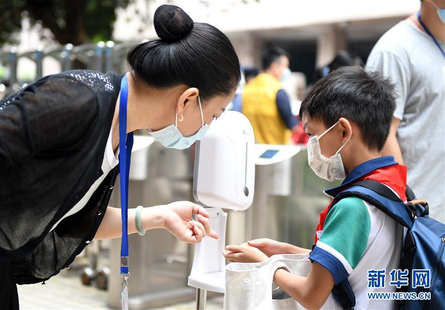 5月25日,广州市荔湾区蒋光鼐纪念小学的老师在校门口指导返校的学生进行手部消毒。当日,广州市各小学一至三年级学生正式开学复课。至此,广州市中小学各年级已全部开学复课。新华社记者卢汉欣摄