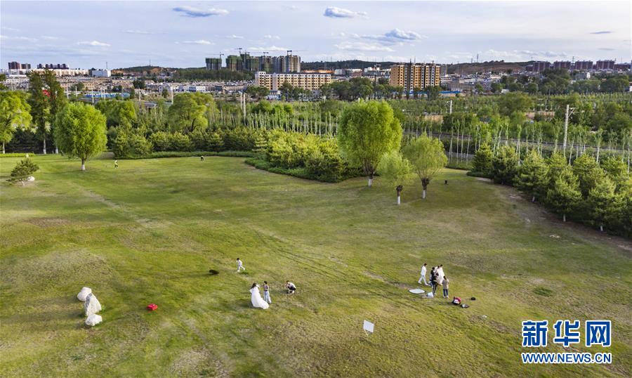 5月24日,市民在榆林市城市绿化带拍摄婚纱照(无人机照片)。新华社记者陶明摄