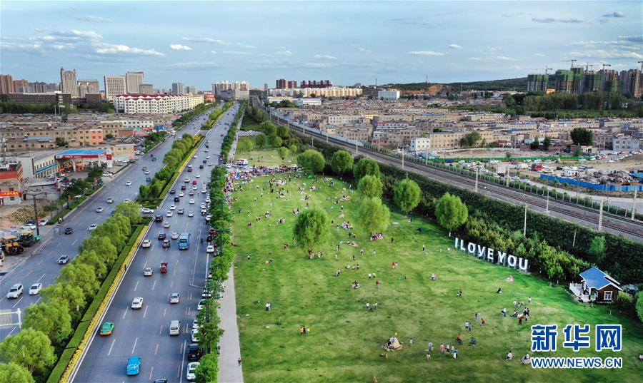 5月24日,市民在榆林市城市绿化带休闲(无人机照片)。新华社记者陶明摄