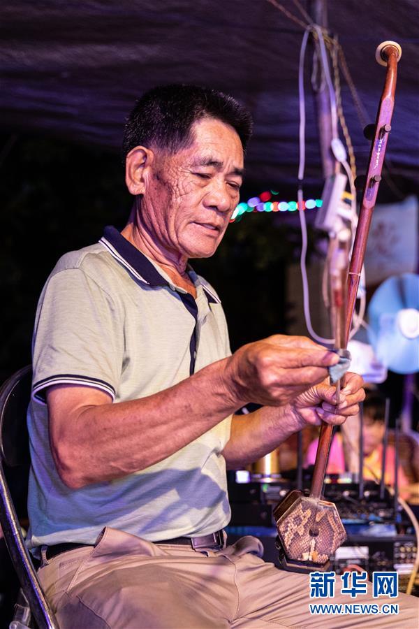 5月24日,海南临高新风人偶戏团成员在演出前调试乐器。新华社记者张丽芸摄