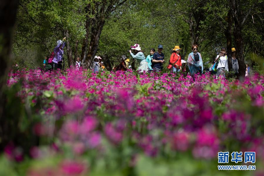 5月24日,游客在四川省汉源县桌子山上观赏报春花。新华社记者江宏景摄