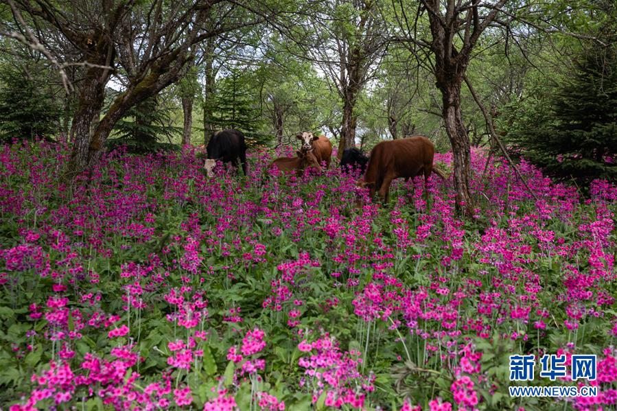 四川省汉源县桌子山上的报春花遍地绽放(5月24日摄)。新华社记者江宏景摄