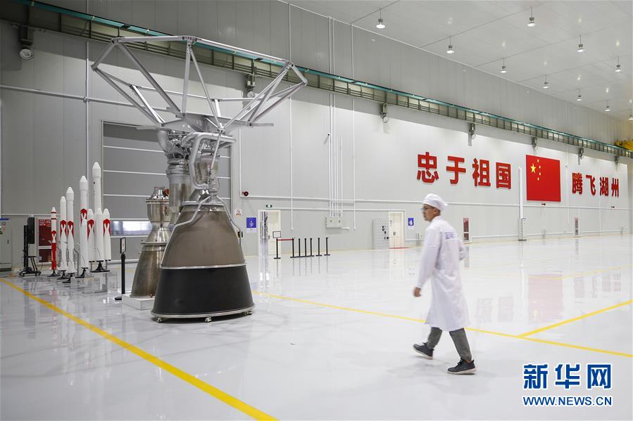5月26日,工作人员走过蓝箭航天智能制造基地发动机装配区内的火箭模型。新华社记者张玉薇摄