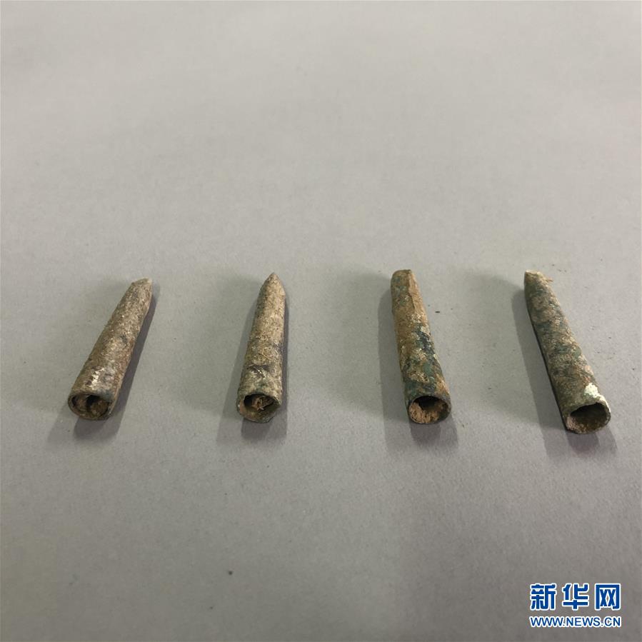 黄河边大型古墓群出土的一组青铜材质的笔帽(5月22日摄)。新华社记者李丽静摄