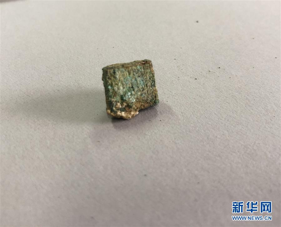黄河边大型古墓群出土的一枚随墓主人下葬的铜印章(5月22日摄)。新华社记者李丽静摄