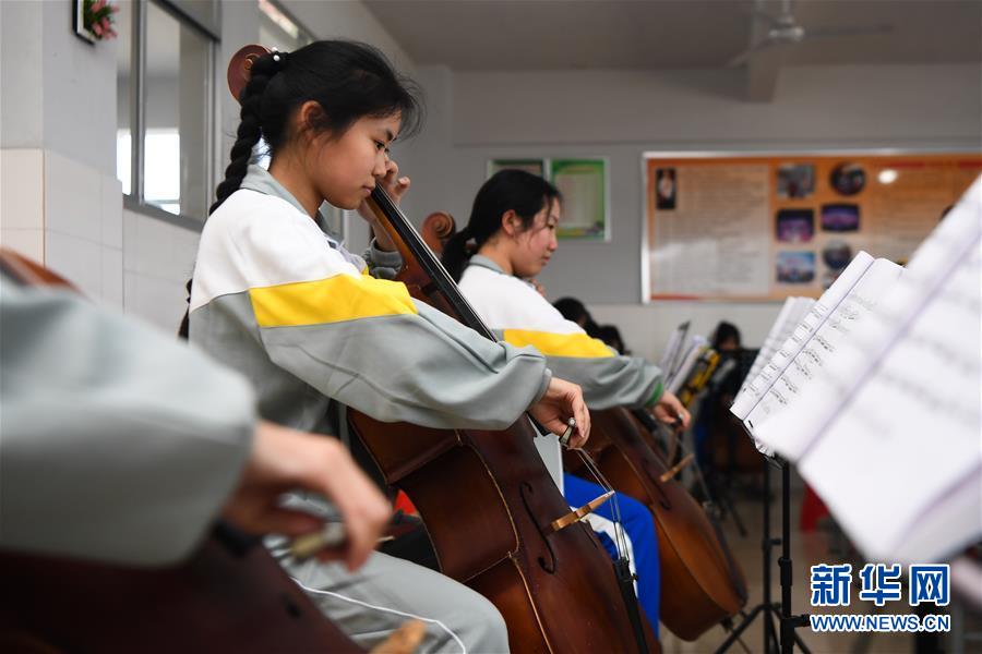 位于湖南省湘西土家族苗族自治州的泸溪县第五中学的学生在练习大提琴(5月22日摄)。新华社记者薛宇舸摄
