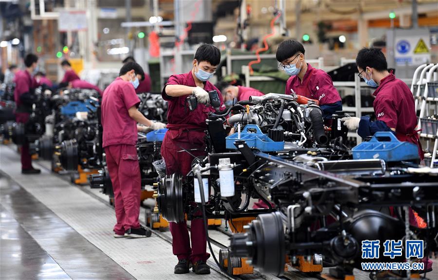 5月26日,工人在江淮汽车新港基地轻卡生产区内忙碌。当日,在位于安徽省合肥市肥西县经济开发区的江淮汽车新港基地轻卡生产区内,工人在做好疫情防控的同时加紧生产。新华社记者刘军喜摄