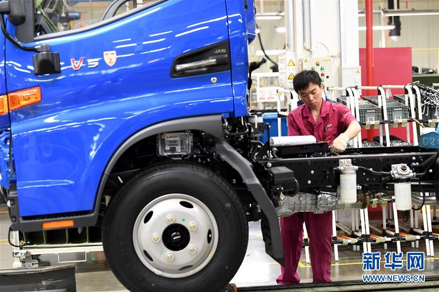 5月26日,工人在江淮汽车新港基地轻卡生产区内忙碌。新华社记者刘军喜摄