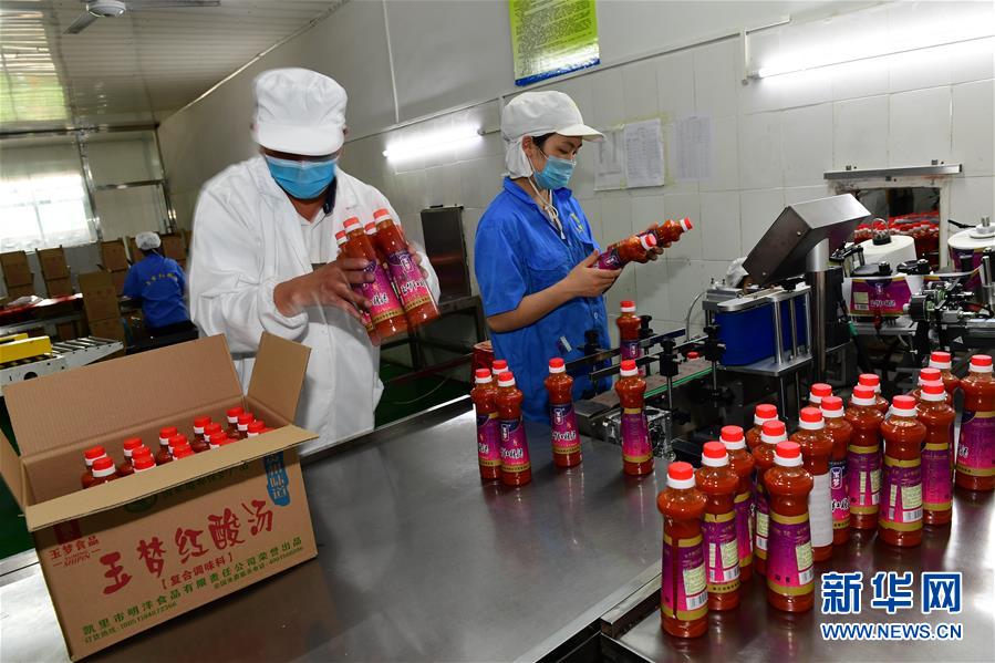 5月26日,在贵州省黔东南苗族侗族自治州麻江县明洋食品公司生产车间,工人将制作好的古法酸汤装箱。新华社记者杨楹摄