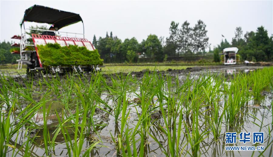5月26日,都江堰市聚源镇笆桥社区的农技人员驾驶插秧机插秧。初夏时节,四川省都江堰市聚源镇笆桥社区农民抢抓农时插秧,田间地头一派繁忙的景象。新华社记者王曦摄