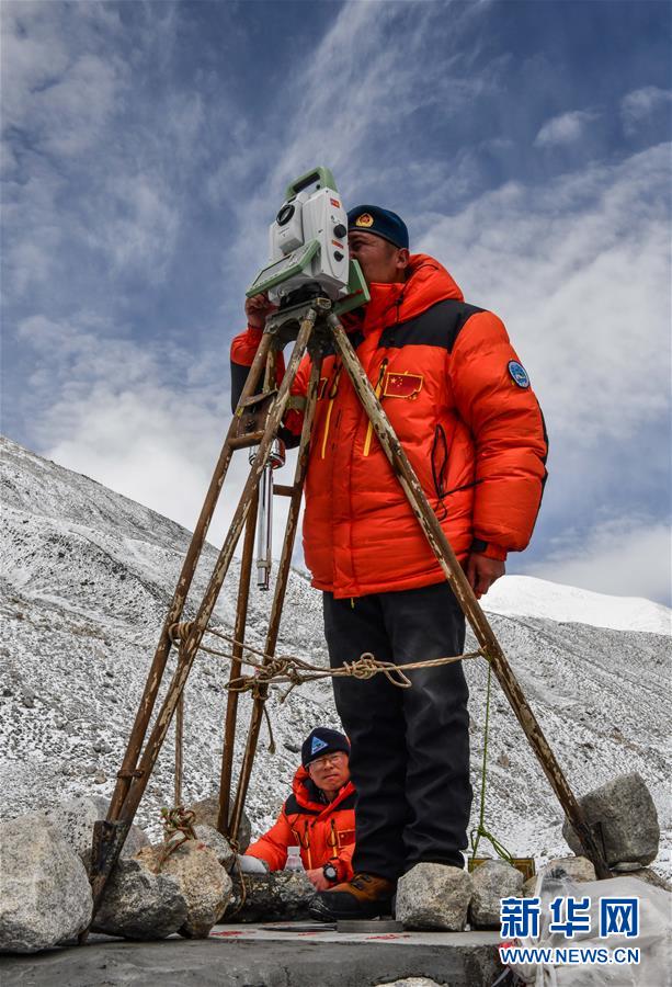 自然资源部第一大地测量队队员郑林(站立者)和武光伟在对珠峰峰顶进行交会观测(5月27日摄)。新华社记者普布扎西摄