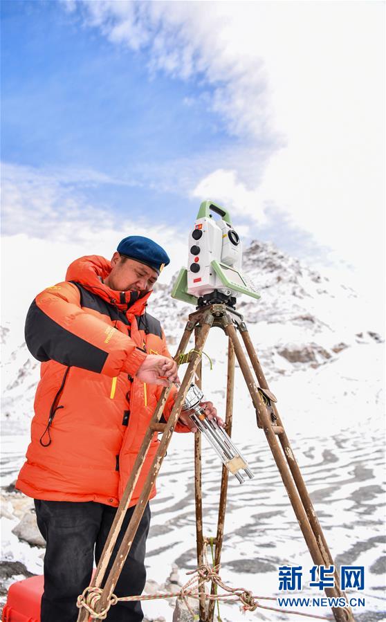 自然资源部第一大地测量队队员郑林在使用全站仪对珠峰峰顶进行交会观测(5月27日摄)。新华社记者孙非摄
