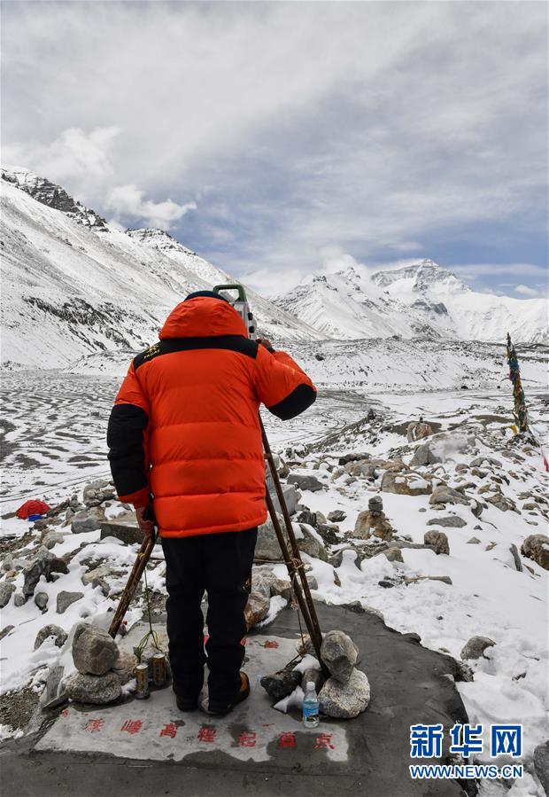 自然资源部第一大地测量队队员郑林在使用全站仪对珠峰峰顶进行交会观测(5月27日摄)。新华社记者普布扎西摄