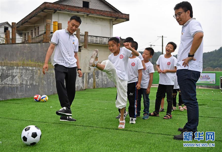 5月27日,在江西省贵溪市金屯镇金屯村渡坊村小组,志愿者和留守儿童一起进行体育活动。