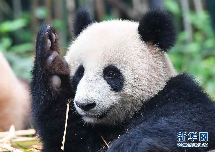 5月27日,被抢走竹子的大熊猫婷仔“举手”望向饲养员。正在享受竹子大餐的广州长隆野生动物世界大熊猫婷仔被大熊猫隆仔抢食,两只大熊猫上演一场争食戏码。新华社记者刘大伟摄
