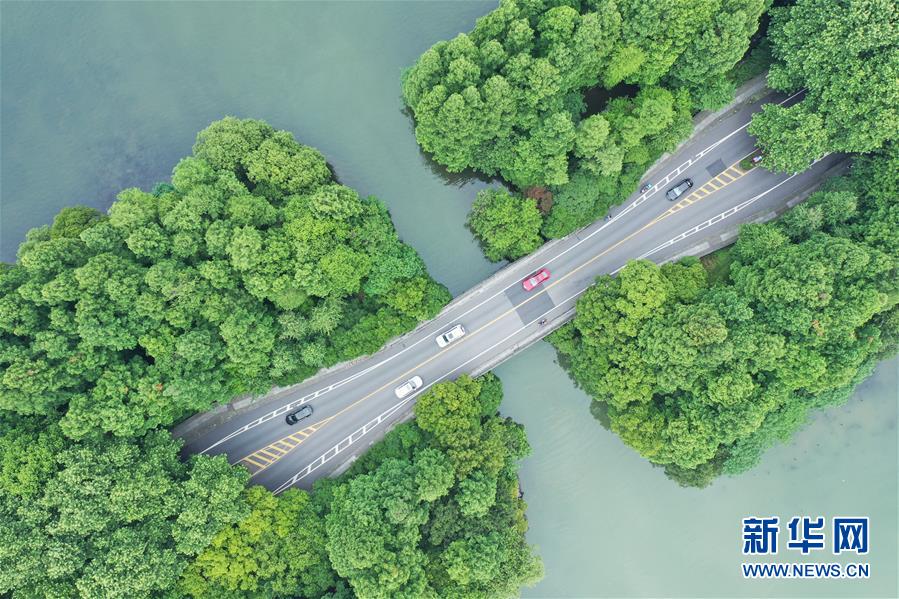 5月27日,车辆行驶在西湖杨公堤上(无人机照片)。随着气温升高,杭州西湖绿意葱茏,展现出柔美的湖光山色。新华社记者翁忻旸摄