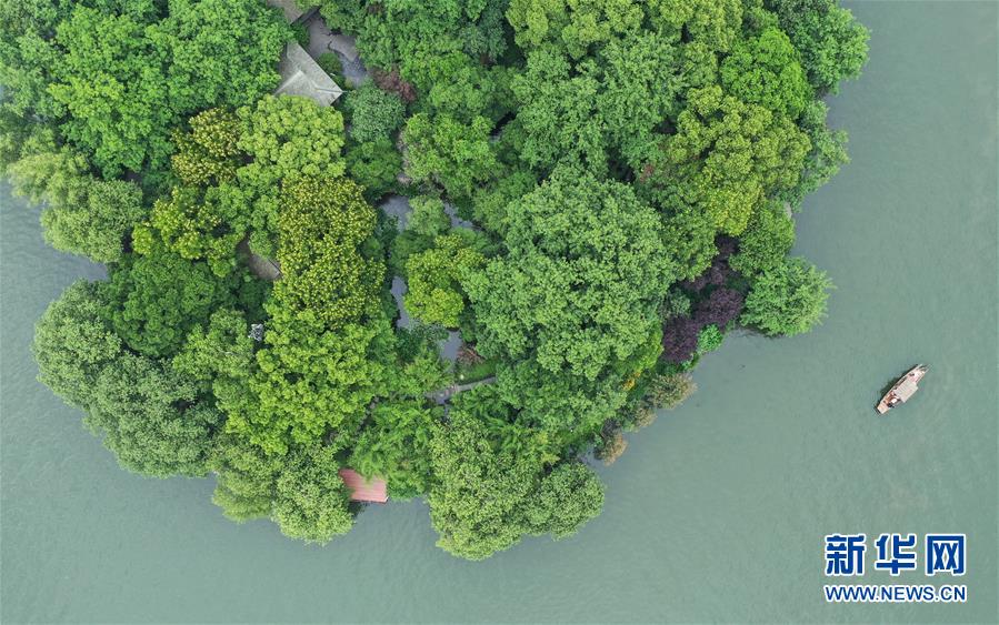5月27日,船只在西湖湖心亭附近行驶(无人机照片)。随着气温升高,杭州西湖绿意葱茏,展现出柔美的湖光山色。新华社记者翁忻旸摄