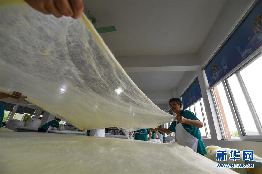 5月27日,在位于桐乡市洲泉镇的浙江蚕缘家纺股份有限公司内,工作人员把加工好的黄金蚕丝进行“拉丝绵”工序,准备用于制作蚕丝被。新华社记者徐昱摄