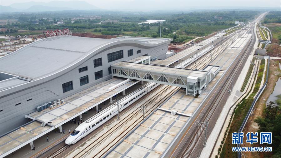 5月27日,试运行检查确认列车停靠在商合杭高铁安吉站(无人机照片)。新华社记者张端摄