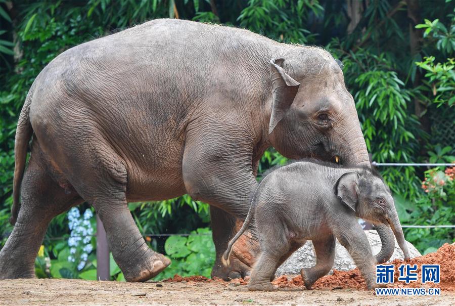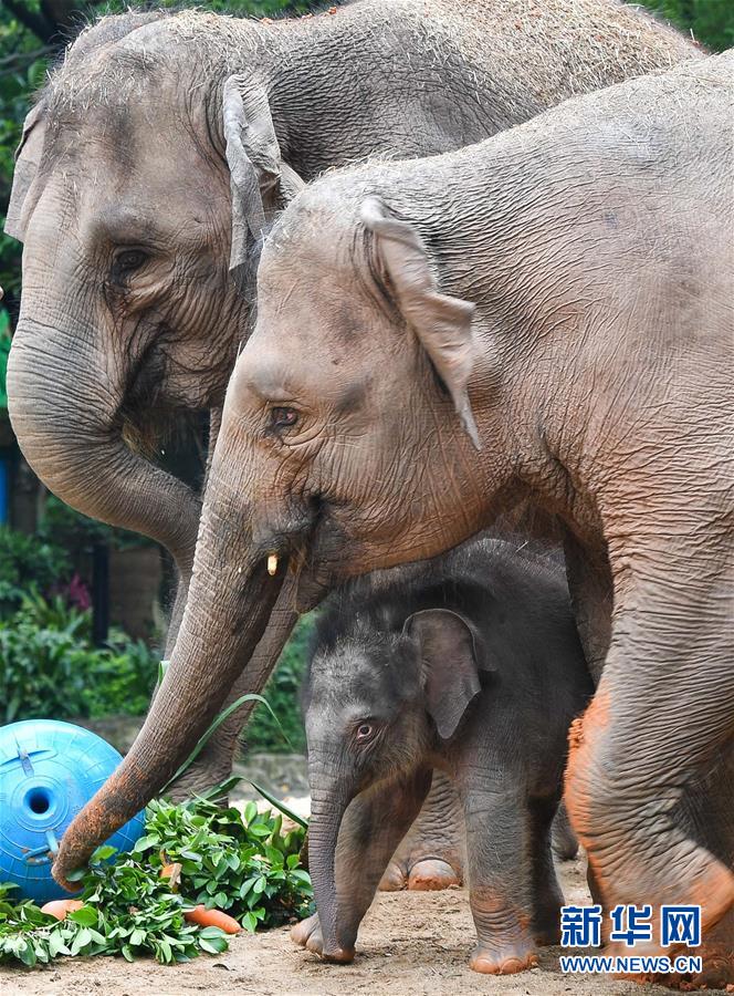 5月27日,广州长隆的新生亚洲象宝宝在妈妈的陪伴下玩耍。新华社记者刘大伟摄