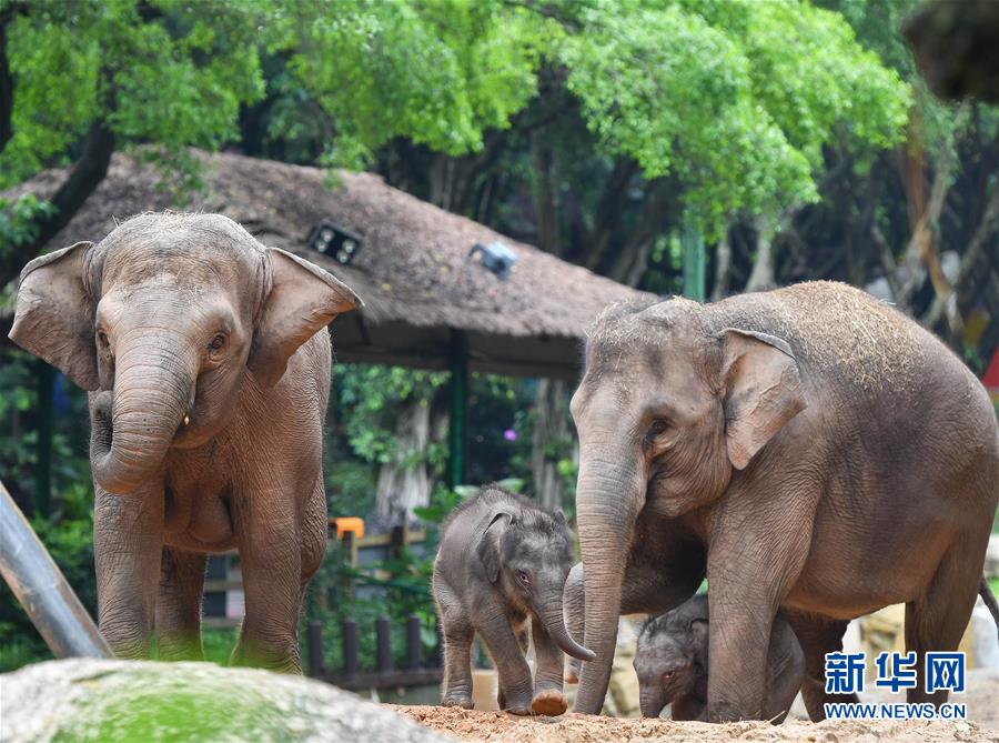 5月27日,广州长隆的两只新生亚洲象宝宝在妈妈的陪伴下玩耍。新华社记者刘大伟摄