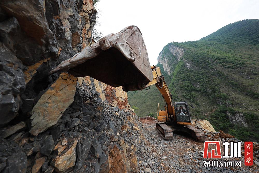 2020年5月27日,在贵州省毕节市纳雍县化作乡双岩头村,挖掘机在观音岩的悬崖边修路。
