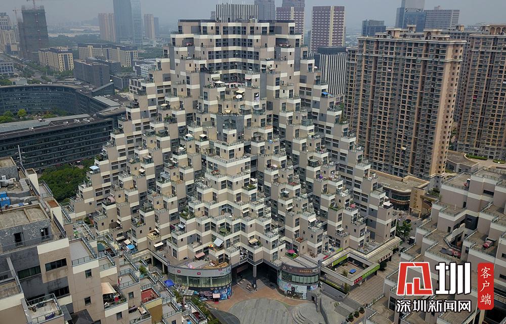 2018年7月29日,航拍江苏省昆山市花桥国际商务城游站未来城小区,空中俯瞰,由三栋楼盘组成的该小区造型奇特,高低错落有致,酷似“金字塔”。