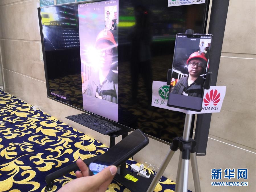 在山西阳煤集团新元煤矿调度中心,记者通过5G网络视频采访井下矿工(5月27日手机拍摄)。新华社记者梁晓飞摄