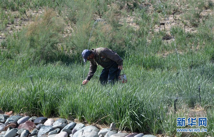 5月28日,工人在巴丹吉林镇生态修复项目南部河道附近修理喷灌设备,以节约用水。2017年以来,内蒙古阿拉善右旗在巴丹吉林镇开展生态修复项目,种植适合在当地生长的马莲、红柳等植物,修复生态的同时也起到美化作用。巴丹吉林镇是巴丹吉林沙漠旅游景区的游客集散地,这里常年干旱少雨,水资源匮乏。新华社记者徐钦摄