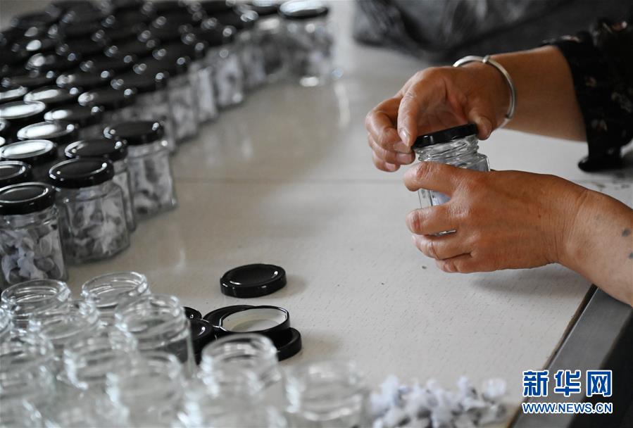 在平顶山市叶县常村镇月台村扶贫车间,村民在赶制用艾草做成的脐贴(5月27日摄)。新华社记者张浩然摄