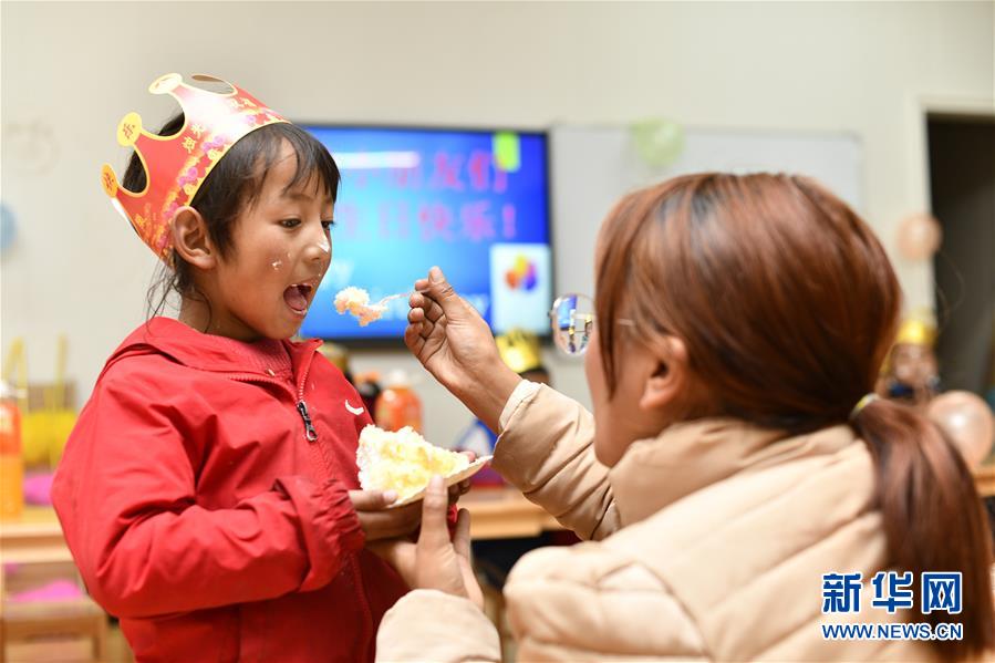 5月27日,玉麦乡小学的老师给孩子喂蛋糕。新华社记者王炳坤摄