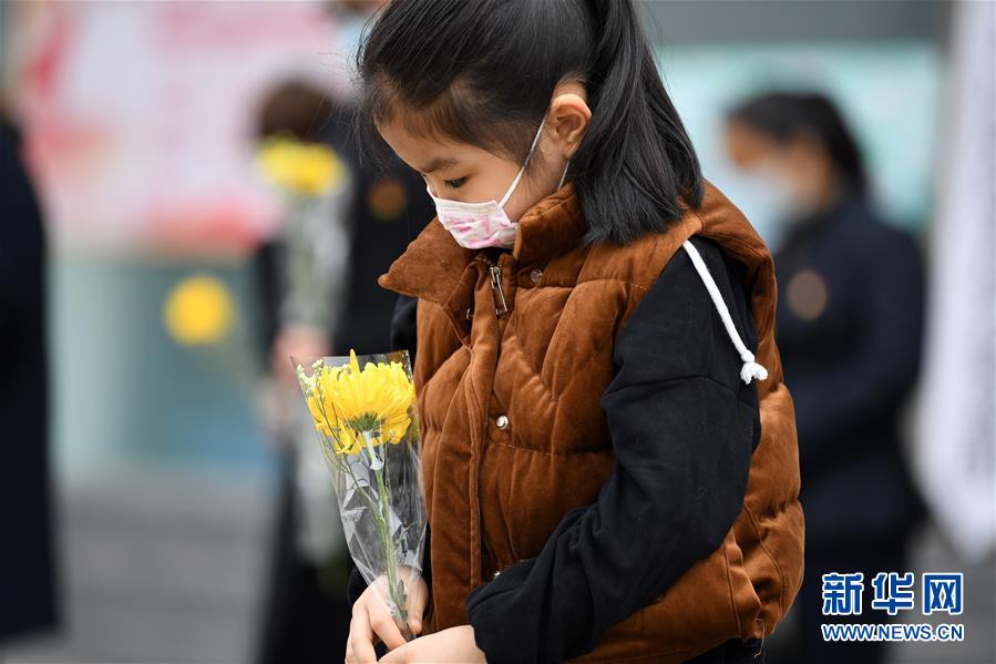 安徽肥西,一名小女孩在哀悼活动上默哀(4月4日摄)。新华社记者刘军喜摄