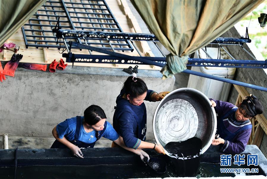 2018年,杨成兰在村里成立传统织染合作社,吸引村里及周边村寨贫困户入股,带动当地贫困户和村民加入合作社,从事织布、染布、蓝靛种植等产业,在传承民族传统手工技艺的同时,帮助村民脱贫增收。新华社记者杨文斌摄