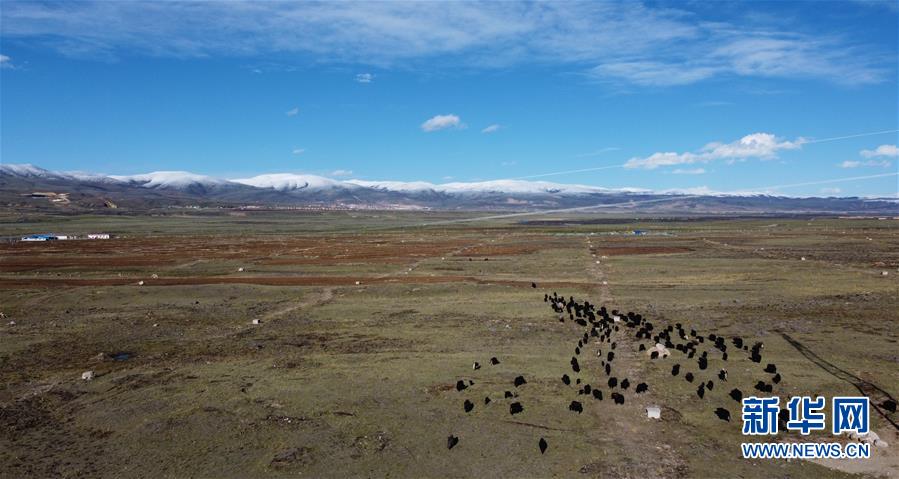 这是5月29日在四川省甘孜藏族自治州理塘县奔戈乡卡灰村拍摄的集体农场(无人机照片)。四川省甘孜藏族自治州理塘县地处青藏高原东部,县城海拔约4000米,有“天空之城”的美誉。时值初夏,理塘的天空碧蓝如洗,巍峨的雪山环绕四周,牦牛星星点点散落于旷野之上,构成一幅高原特有的壮美图景。新华社记者李梦馨摄
