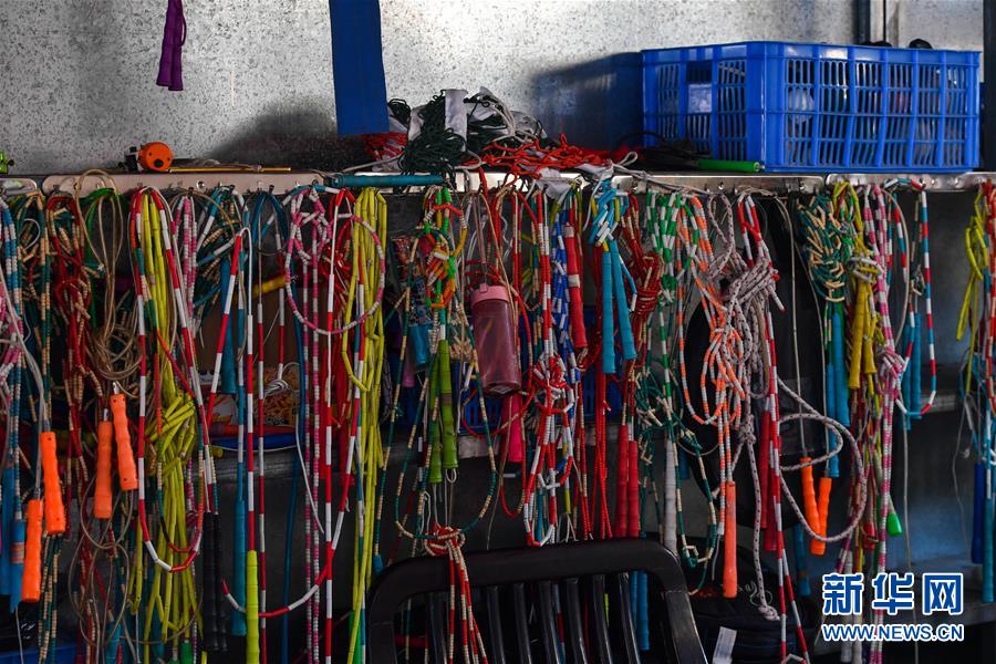 跳绳运动已经深深融入七星小学的日常,器材室里摆放的跳绳(2019年11月18日摄)。新华社记者刘大伟摄