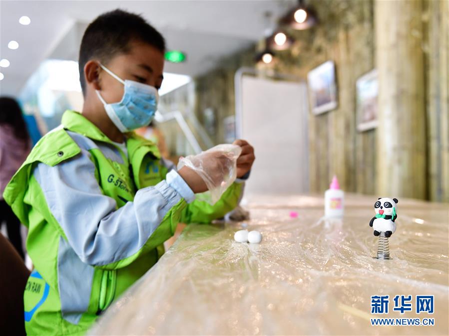 5月31日,小朋友在西宁熊猫馆内制作熊猫摆件。新华社记者张龙摄