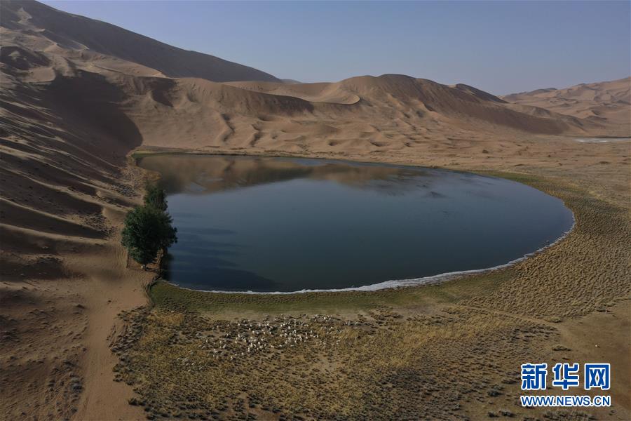 5月30日,羊群在巴丹吉林沙漠一处沙漠湖泊的湖畔休憩(无人机照片)。新华社记者徐钦摄。