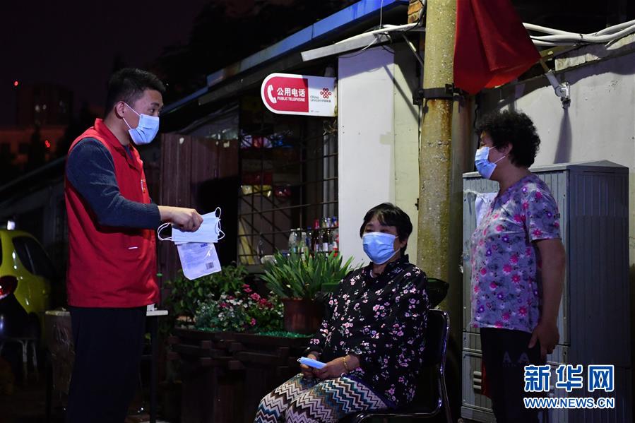 杨龙明在小区内给住户发放口罩(6月1日摄)。新华社记者李然摄。