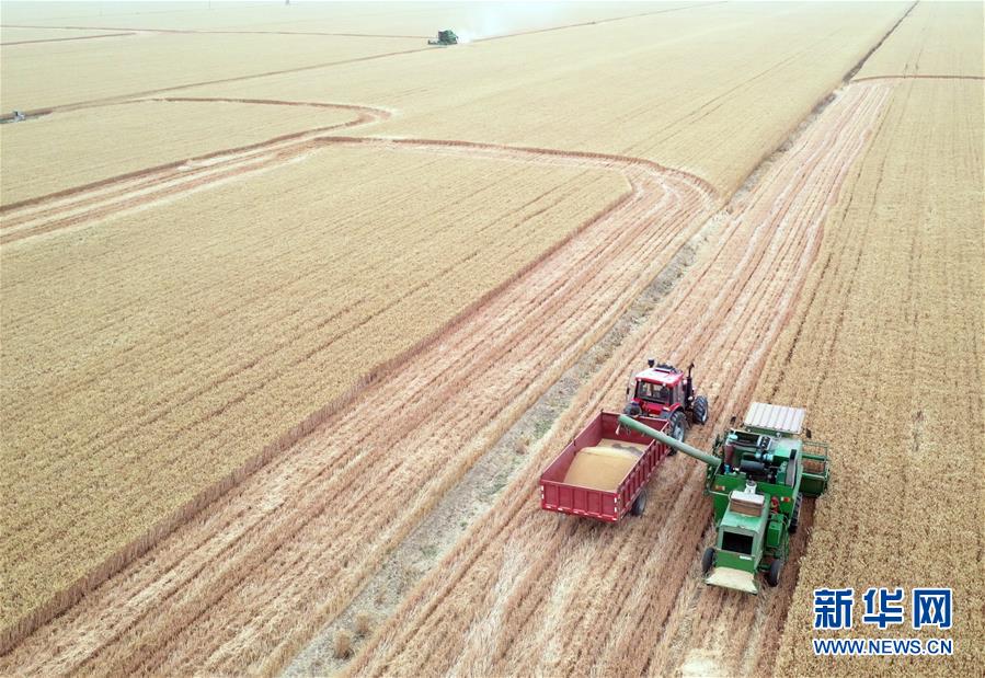 6月2日,在河南省黄泛区农场九分场的麦田里,农民操作大型收割机收获小麦(无人机照片)。新华社记者李嘉南摄。