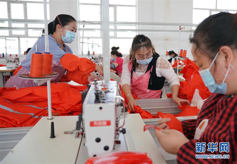 6月2日,工人在尚义县大青沟镇的易地扶贫搬迁集中安置小区附近一家扶贫工厂工作。