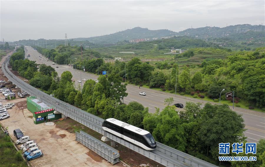 6月3日,一台“云巴”在专用运行轨道上进行调试(无人机照片)。近日,重庆市首条“云巴”示范线项目在重庆璧山区正式亮相。此次发布的“云巴”采用电能驱动,具有转弯半径小、爬坡能力强、噪音低、安全性高、建设成本低、建造周期短等优势,能为乘客提供更智能、舒适、便捷的出行体验。据介绍,璧山区“云巴”示范线项目自2019年8月开建,线路正线全长15.4km,共设车站15座,预计2020年9月全线通车。新华社记者刘潺摄。
