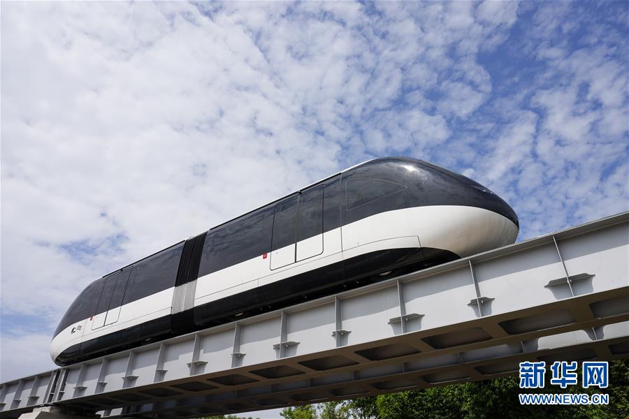 6月3日,一台“云巴”在专用运行轨道上进行调试(无人机照片)。近日,重庆市首条“云巴”示范线项目在重庆璧山区正式亮相。此次发布的“云巴”采用电能驱动,具有转弯半径小、爬坡能力强、噪音低、安全性高、建设成本低、建造周期短等优势,能为乘客提供更智能、舒适、便捷的出行体验。据介绍,璧山区“云巴”示范线项目自2019年8月开建,线路正线全长15.4km,共设车站15座,预计2020年9月全线通车。新华社记者刘潺摄。